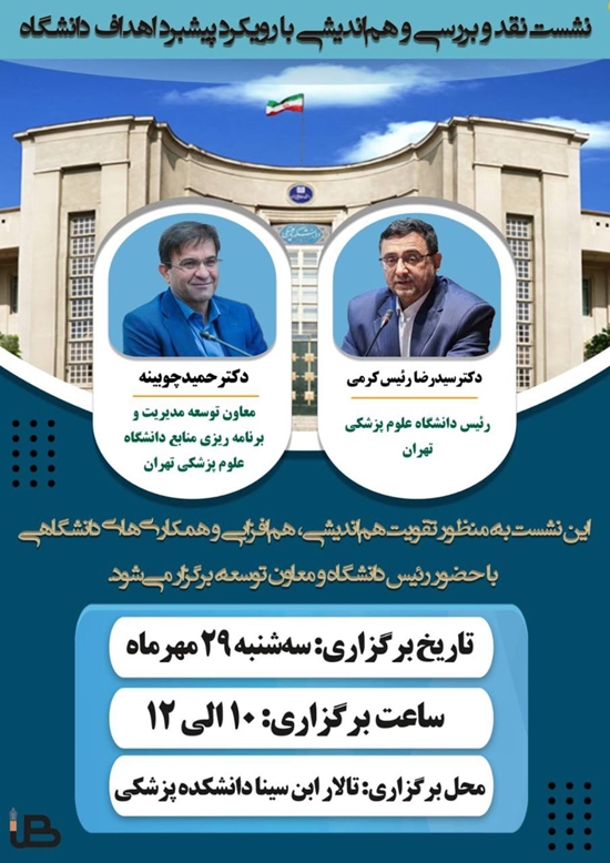 دکتر سید رضا رئیس کرمی، رئیس دانشگاه علوم پزشکی تهران، به همراه دکتر حمید چوبینه، معاون توسعه با اعضای هیئت علمی و کارکنان شریف، در نشست نقد و بررسی و هماندیشی با رویکرد پیشبرد اهداف دانشگاه شرکت خواهند کرد. این نشست که سهشنبه 29 مهر 1404 از ساعت 10 تا 12 در تالار ابن سینا دانشکده پزشکی برگزار میشود، فرصت مناسبی برای تبادل تجربهها و نظرات همکاران و بهرهگیری از منظرهای گوناگون فراهم میآورد. برگزاری منظم این نشستها تأکید بر رویکرد مشارکتی و هماندیشی در مدیریت دانشگاه است.